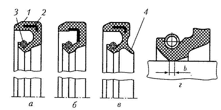Манжета (рис.2.41, а – в) состоит из корпуса 1, изготовленного из маслобензостойкой резины, каркаса 2, представляющего собой стальное кольцо Г – образного сечения, и браслетной пружины 3.Каркас придает манжете жесткость и обеспечивает ее плотную посадку в корпусную деталь без дополнительного крепления. Браслетная пружина стягивает уплотняющую часть манжеты, вследствие чего образуется рабочая кромка шириной b= 0,4…0,6 мм (рис.1.41,г), плотно охватывающая поверхность вала