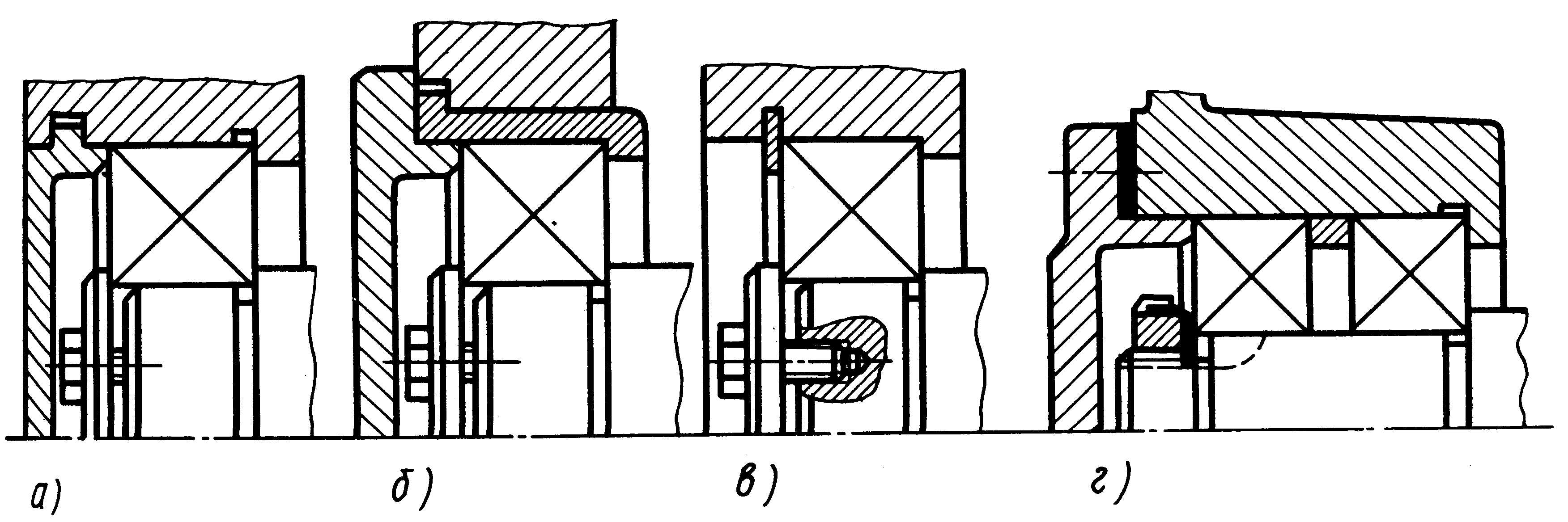 Рис.2.43.Конструкция регулировочных устройств подшипника (на рис.в, г, д совмещены торцевая и врезная крышка