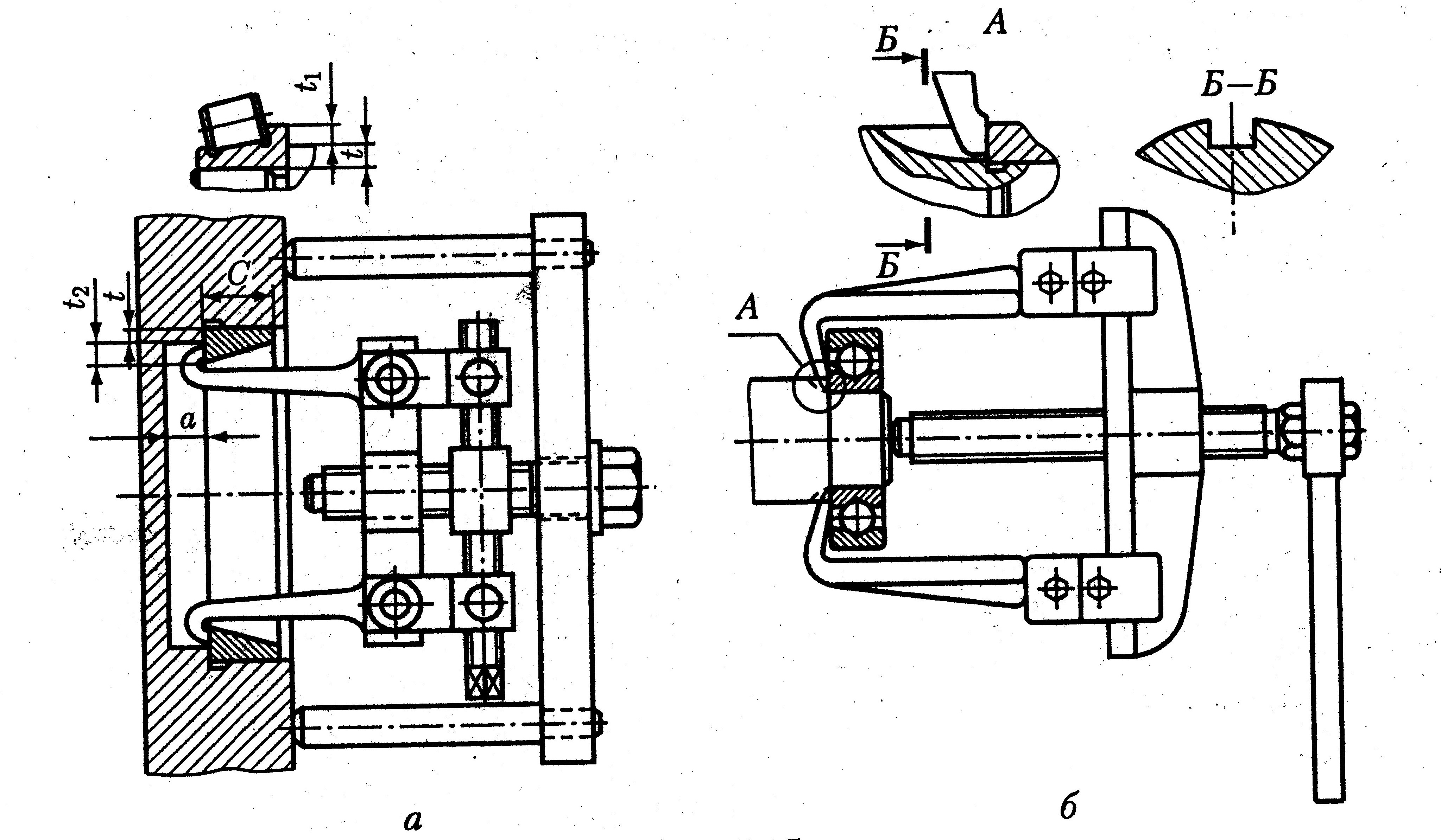 При удалении подшипника из корпуса его нужно захватить за наружное кольцо (рис.2.45,а). а при снятии с вала – за внутреннее (рис. 2.45,б). чтобы можно было захватить тягами съемника кольцо подшипника, высота заплечика t не должна быть чрезмерно большой. При высоких заплечиках нужно предусматривать пазы для размещения тяг съемника (рис.2.45,б – выносной элемент А)