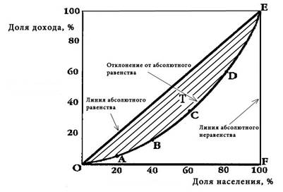 Линия OABCDE показывает фактическое распределение совокупного дохода. Заштрихованная площадь показывает степень неравенства в распределении доходов. Обозначим ее через Т. Разделив Т на площадь треугольника OEF, получим коэффициент Джини, показатель степени неравенства доходов: