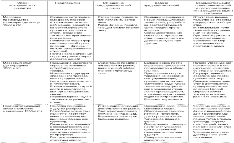 Менеджмент развивался в соответствии с теми задачами и проблемами, которые выдвигала очередная историческая эпоха, т. е. условиями развития менеджмента. Рассмотрим трактовку, предлагаемую известным специалистом в области управления И. Ансоффом.8 Он разбивает историю развития предпринимательства на три эпохи: массовое производство, массовый сбыт, постиндустриальная эпоха (табл. 1.1).9