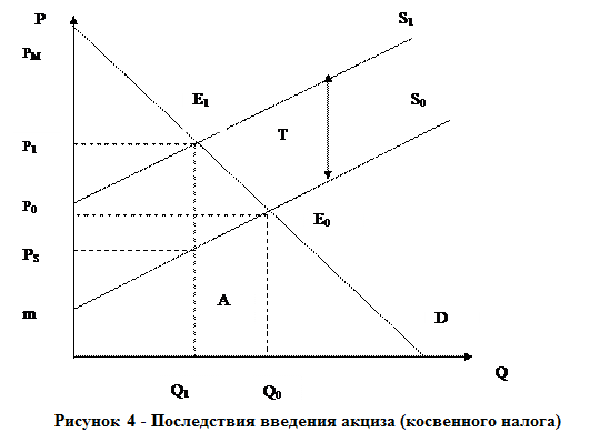 На рис.4 точка E0 представляет рыночное равновесие до введения налога. Вследствие установления налога (акциза) в размере Т ден.ед. с единицы проданной продукции линия предложения сдвигается вверх на величину налога (S0®S1), так как теперь каждая единица обходится производителю на Т ден. ед. дороже. Спрос и предложение уравниваются при цене Р1, из которой производителю достается только PS=P1-T. Таким образом, с введением налога повысилась цена для покупателей и снизилась цена для производителей. В результате уменьшились и объем спроса, и объем предложения, так что новое равновесное количество оказалось меньше первоначального.