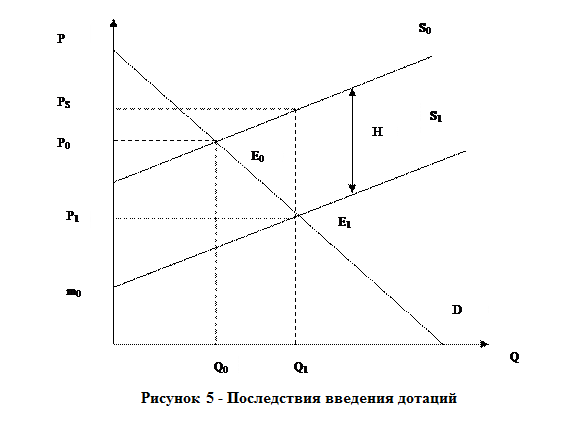 Последствия дотации единицы реализованной продукции в размере Н ден.ед. показаны на рис. 5.Без дотации рыночное равновесие устанавливается в точке E0. Дотация для производителя равносильна тому, что часть производственных затрат государство берет на себя, и поэтому линия предложения сдвигается вниз на величину дотации (S0 — S1). Равновесной становится комбинация Q1P1. Для покупателей цена снизилась (Р0 > Р1), что увеличило платежеспособный спрос, а для производителей — повысило, следовательно, и увеличило объем предложения. В результате равновесное количество увеличилось. Сумма выплаченной государством дотации отображается площадью PSBE1P1. Выигрыш производителей в виде приращения их излишка равен площади P0E0BPs,, выигрыш потребителей соответствует площади Р0Е0Е1P1. Площадь треугольника E0ВЕ1 показывает чистые потери общества, возникающие вследствие представления дотации производителям.