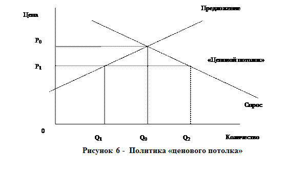 Прямое регулирование цен осуществляется в основном тремя способами: путем установления «ценового потолка» (максимальных цен), «ценового пола» (минимальных цен) и «ценового коридора». Наибольшее распространение получила политика «ценового потолка», которая используется в монополизированных отраслях (электроэнергетика, нефтегазовая промышленность, транспорт, коммунальное хозяйство), в кризисных ситуациях (во время войн, послевоенный период), при установлении цен на социально значимую продукцию (хлеб, молочные продукты, медикаменты и т.п.). Выполняя важную роль, максимальные цены, устанавливаемые государством ниже уровня равновесия, создают ряд проблем в экономике (рисунок 6).
