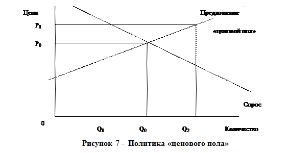 На таком рынке образуются излишки продукции (Q2 > Q1), которые государство вынуждено скупать и каким-то образом затем ими распоряжаться (образовывать запасы, реализовывать на внешнем рынке и т.п.). Уровень потребления в условиях проведения политики "ценового пола" тоже оказывается ниже, чем в условиях равновесного рынка (Q1 < Q2) .