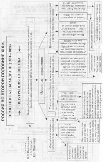Царём стал сын убитого императора Александр, в царствование которого огромное влияние на внутреннюю политику оказывал обер-прокурор Святейшего СинодаК.П. Победоносцев, политические воззрения которого опирались на необходимость сохранения для России самодержавия и православия. В силу этого любые изменения в противоположном направлении воспринимались им крайне негативно. В целом время правленияАлександра III оценивается как период контрреформ. Буквально накануне убийства Александр II подписывает так называемый"Конституционный проект" Лорис-Меликова, который отменяет его сын, увольняя при этом всех прогрессивных министров, проводивших политику реформ 60 - 70-х гг. Александр III считал, что эти реформы были слишком либеральными, поэтому его отец так трагически и закончил свои дни. Свою главную задачу Александр III видел в недопущении революции в России, в подавлении любой оппозиции, посягающей на устои государства. Словом, попытка революционного переворота, наоборот, привела к усилению политической реакции. Воспринимавший многие действия своего отца как недопустимый либерализм и мягкость, Александр III провёл серию мероприятий законодательного характера, имевших целью ослабить воздействие буржуазных реформ на русское общество. В частности, был принят ряд мер с целью укрепить общину и помещичье землевладение, в которых он видел опору своего государства. Было ограничено самоуправление высших учебных заведений, существенные ограничения претерпела печать, был закрыт ряд изданий, введена должность земского начальника, выбираемого исключительно из дворян, который обладал большой административной и судебной властью и мог контролировать деятельность крестьянского самоуправления. В целом эти и ряд других мер получили наименование контрреформ, но затормозить развитие страны по буржуазному пути они, конечно, не могли. Экономика страны интенсивно развивалась, тяжёлая промышленность преодолела кризис пореформенной эпохи и набирала темпы. Страна покрылась сетью железных дорог, что само по себе стимулировало промышленное развитие. В 80-е гг. завершился промышленный переворот, крупная фабричная промышленность сильно потеснила мелкую кустарную и мануфактуру, хотя доля последней и продолжала ещё оставаться заметной в общем объёме производства. Наиболее развитой продолжает оставаться текстильная отрасль, где чаще и полнее внедряются новейшие изобретения. Следует отметить такой факт, как всё усиливающиеся внедрения иностранного капитала. Появляются новые промышленные области: Донбасс, Кривой Рог, Баку. Бурное развитие промышленности привело к существенным изменениям в социальной структуре населения: в промышленно развитых городах всё заметнее становилась прослойка рабочего класса, крепла финансово и становилась многочисленней буржуазия. В области внешней политики царствование Александра III характеризуется почти полным отсутствием войн: только в самом его начале относительно небольшие по числу задействованных сил (сравнительно с войнами в Европе) боевые действия велись в Средней Азии - в Туркмении. На этом закончилось присоединение Средней Азии к России, особенно интенсивно проходившее в предыдущее царствование. Это до предела обострило отношения с ВБ, которая имела свои интересы в этом регионе. В Европе произошёл 