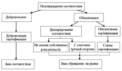 Подтверждение соответствия может осуществляться в двух формах: обязательной – на соответствие требованиям технических регламентов, и добровольной – для установления соответствия стандартам и другим документам добровольного применения (рис. 2.3).