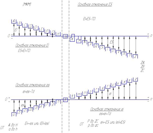 Для отверстий – основное отклонение обозначается прописными буквами латинского алфавита от A до Z; для валов – строчными от a до z.