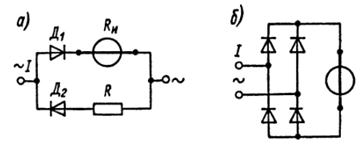 При использовании схемы двухполупериодного выпрямления выпрямленный ток проходит через измерительный механизм в обе половины периода и, следовательно, чувствительность этих схем выше, чем однополупериодных. На рис.4,б показана наиболее распространенная двухполупериодная схема выпрямления — мостовая.