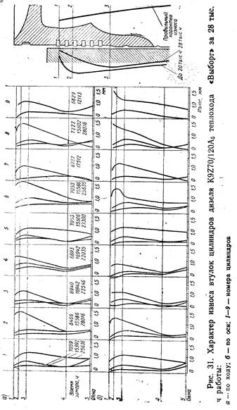 Анализ характера износа поршневых канавок (кепов) подтверждает уменьшение аксиального зазора в начальные часы работы дизеля за счет остаточных деформаций материала головок поршней в результате работы в зоне высоких температур (рис. 30). Первоначальный монтажный зазор в канавке кольца приобретают через различные промежутки времени, от 5 до 10 тыс. часов работы дизеля. До получения рабочего зазора в канавках кольца имеют слабую подвижность, сопровождающуюся интенсивным износом и неправильной приработкой пары втулка—кольцо. Этот фактор длительное время способствует бессистемной замене компрессионных колец. Характер износа втулок теплохода «Выборг» (рис. 31) подтверждает слабую подвижность колец по причине высокой тепловой напряженности головки поршня.