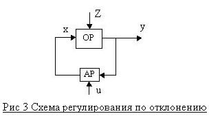 В системах, работающих по отклонению регулируемой от заданного значения (рис. 3), возмущение zвызывает отклонение текущего значения регулируемой величины yт от ее заданного значения uз. Автоматический регулятор АР сравнивает значения yиu, при их рассогласовании вырабатывает регулирующее воздействие xсоответствующего знака, которое через исполнительное устройство (на рис. Не показано) подается на объект регулирования ОР, и устраняет это рассогласование.