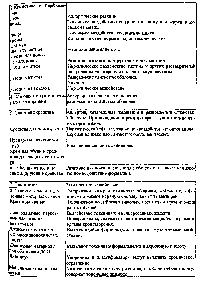 | 1.Синтетические ткани и ковровые изделия (капрон, нейлон, полиэфирные, полиакрилонитрильные, поливинилхлоридные, полиолефиновые) | Раздражение кожи и возникновение аллергий из-за выделения летучих токсичных продуктов |