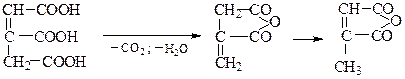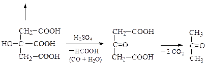 При нагревании лимонная кислота (как b-гидроксикислоты) превращается в аконитовую кислоту, которая распадается далее на смесь итаконового и цитраконового ангидридов. В присутствии H2SO4 лимонная кислота, как a-гидроксикислота, отщепляет муравьиную кислоту и образует ацетондикарбоновую кислоту.