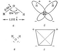 Атом кислорода находится в sp3-гибридном состоянии и имеет форму тетраэдра (рис. г). Электроны атомов водорода смещены в сторону более электроотрицательного атома кислорода, поэтому в молекуле воды существует разделение зарядов. То есть молекула воды является диполем: неподеленные электронные пары кислорода создают отрицательный полюс, а атомы водорода – положительный (рис. б).