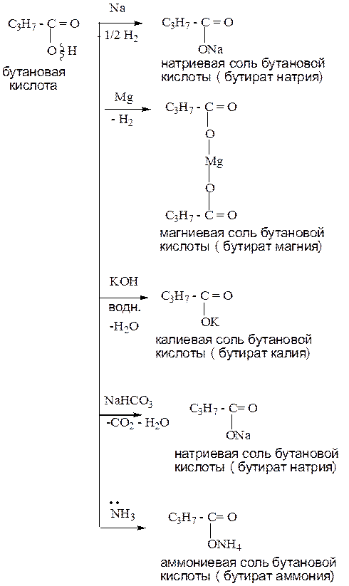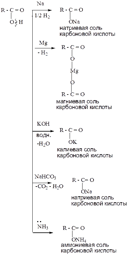 При взаимодействии карбоновых кислот с металлами (Na, K, Mg и др.), водными растворами щелочей, карбонатами, аммиаком образуются соли. Данная реакция подтверждает кислотные свойства карбоновых кислот. В реакции с аммиаком протон из карбоксильной группы присоединяется к атому азота (по неподеленной электронной паре), затем, катион аммония возвращается и присоединяется к атому кислорода.