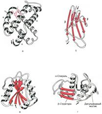 Термин третичная структура относится к способу укладки полипептидной цепи с образованием компактной, плотно упакованной структуры, характерной для глобулярных белков. Третичная структура поддерживается связями трех типов – ионными, водородными, дисульфидными и гидрофобными взаимодействиями. В количественном отношении наиболее важны гидрофобные взаимодействия, белок при этом сворачивается таким образом, чтобы его гидрофобные боковые цепи были скрыты внутри молекулы, т.е. защищены от соприкосновения с водой, а гидрофильные боковые цепи, наоборот, выставлены наружу.