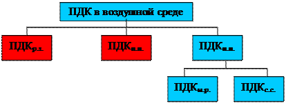 Для санитарной оценки воздушной среды установлены несколько видов ПДК: в воздухе рабочей зоны – ПДКр.з. (производственного помещения); на территории промышленного предприятия – ПДКп.п. (обычно принимается значение 0,3ПДКр.з.); в атмосферном воздухе населенного пункта – ПДКн.п..