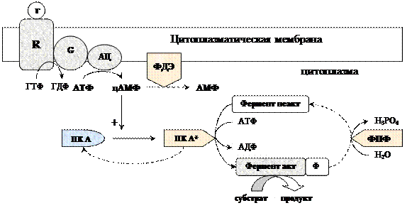 1). 1 Гормон (Г) присоединяется к Rs-рецептору с образованием гормон-рецепторного комплекса, который через несколько Gs-белков активирует несколько аденилатциклаз (комплекс гормон-Ri-рецептор через Gi-белки ингибирует аденилатциклазы);