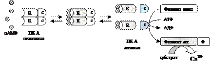 ПК А есть во всех клетках. Участвует в аденилатциклазной системе, стимулируется цАМФ. Состоит из 4 субъединиц: 2 регуляторных (R) и 2 каталитических (С). Регуляторные субъединицы имеют по 2 участка связывания цАМФ. Тетрамер не обладает каталитической активностью. Присоединение 4 цАМФ к 2 субъединицам R приводит к изменению их конформации и диссоциации тетрамера. При этом высвобождаются 2 активные каталитические субъединицы С, которые катализируют реакцию фосфорилирования белков-ферментов.
