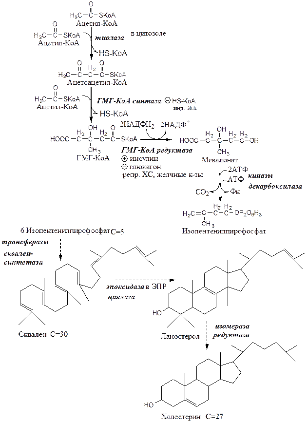 Реакции синтеза ХС происходят в цитозоле и ЭПР клеток. Это один из самых длинных метаболических путей в организме человека (около 100 последовательных реакций).