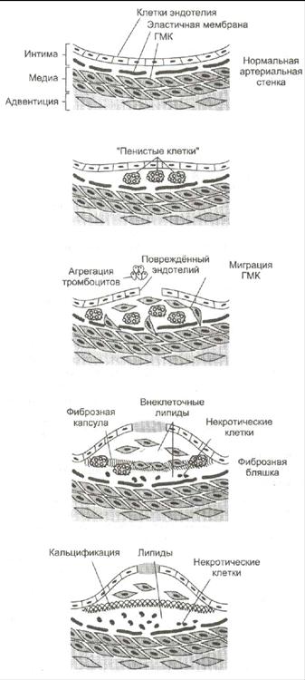 1. Стадия измененного эндотелия. На поверхности поврежденного эндотелия скапливаются тромбоциты и моноциты. Модифицированные ЛПНП проникают под поврежденный эндотелий сосудов. За ними направляются моноциты (в ткани они макрофаги) и захватывают ЛП через скевенджер-рецепторы. Этот процесс не ингибируется избытком ХС, поэтому макрофаги перегружаются ХС и превращаются в «пенистые клетки». Отдельные «пенистые клетки» есть у новорожденных.