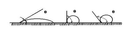 При смачивании твердого тела жидкостью наблюдается растекание капли по поверхности вплоть до образования монослоя. Смачивание не всегда бывает полным, в этом случае между каплей и поверхностью образуется так называемый угол смачивания. Его величина может быть больше, или меньше 900, как это показано на рис. 4.2. Принято проводить измерение угла смачивания со стороны жидкой фазы.