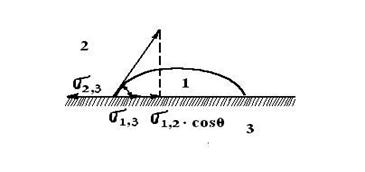 Рис. 4.3. Зависимость краевого угла от поверхностных натяжений на разных границах раздела: 1 – жидкость; 2 – воздух.; 3 – твердое тело