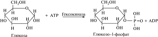 Донор фосфорной кислоты — АТР, в молекуле которой расщепляется высокоэнергетическая связь. Под действием фермента гексокиназа остаток фосфорной кислоты переносится на глюкозу к первому углеродному атому (рис. 6).