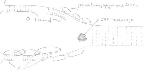 Другие белки образуют репликативную вилку - дестабилизирующие белки (рис.2), которые выстраиваются в ряды на образовавшейся одноцепочечной ДНК, растягивают её остов и делают основания нуклеотидов более доступными для спаривания. Для того чтобы репликативная вилка могла продвигаться вперёд со скоростью равной 50 нуклеотидов в секунду, родительская спираль должна вращаться 50 оборотов в секунду. Этого не происходит, т.к. при действии топоизомеразы образуется шарнирный участок, т.е. временный разрыв цепи, возникающий под её действием, даёт возможность спирали ДНК по обе стороны от него вращаться.