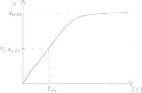 При низкой концентрации субстрата и последующем её увеличении зависимость между [субстрата] и V прямо пропорциональна. Дальнейшее увеличение концентрации субстрата приводит к снижению скорости, и наконец, наступает такое значение концентрации субстрата, после которой скорость ферментативной реакции остаётся неизменной. Это называется эффектом насыщения фермента субстратом. Для характеристики кинетики в ферментативных реакциях была вычислена константа Михаэлиса - Ментен (Michaelis&Menten), которая выражается: Km= (E)*(S)-(ES)/(ES)