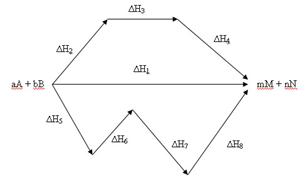 Продукты реакции М и N могут быть получены различными путями: 1) непосредственно реакцией, тепловой эффект которой равен ∆Н1; 2) реакциями, тепловые эффекты которых равны соответственно ∆Н2, , ∆Н3, и ∆Н4; 3) рядом реакций с тепловыми эффектами ∆Н5 , ∆Н6 , ∆Н7 и ∆Н8. Эти тепловые эффекты, согласно закону Гесса, связаны между собой соотношением ∆Н1 = ∆Н2 + ∆Н3 + ∆Н4 = ∆Н5 + ∆Н6 + ∆Н7 + ∆Н8 .