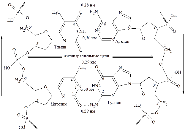Тимин связан тремя водородными связями с аденином ТºА, цитозин двумя водородными связями с гуанином G = С. Эти пары оснований называются комплементарными парами оснований. Благодаря этому нуклеотидная последовательность одной цепи полностью комплементарна последовательности другой.