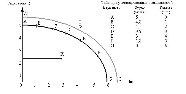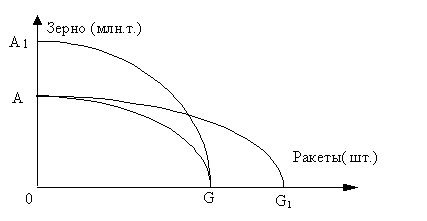 Из таблицы видно, что всякое увеличение производства ракет (с 0 до 6 штук) снижает производство зерна (с 5 млн. до 0 млн. т), и наоборот . Линия ABCDEFG, что называют кривой производственных возможностей, показывает альтернативные варианты при полном использовании ресурсов. Все точки, расположенные внутри фигуры OAG, означают неполное использование ресурсов, например точка К (одновременное производство 2,5 млн. т. зерна и трех ракет). И наоборот, любая производственная программа, которая характеризуется точками за пределами фигуры OAG, не будет обеспечена имеющимися ресурсами (например, точка I). Кривая производственных возможностей обычно имеет выпуклую форму (вогнутая к началу координат). Это означает, что, изменяя структуру производства, например, в пользу ракет, мы будем в большей мере использовать в производстве ракет сравнительно малоэффективные для этого ресурсы. Поэтому каждая дополнительная ракета требует все большего сокращения производства зерна (и наоборот). Производство первой ракеты вызвало сокращение производства зерна на 0,2 млн. т., второй - на 0,3, третьей - на 0,6 и т.д.Если увеличение ресурсов или общее повышение эффективности происходит равномерно, то кривая AG смещается к положению А'' (см. рис. 3.1). Если происходит одностороннее увеличение эффективности производства одного из благ, то сдвиг носит асимметрический характер (см. рис. 3.2). Например, при повышении эффективности производства зерна кривая AG смещается к положению. А1G, при повышении эффективности производства ракет - к положению AG1.
