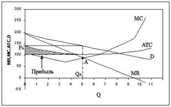 Максимизирующий прибыль объем производства достигается при равенстве предельного дохода и предельных издержек, т.е. находится в точке пересечения МС и MR. Поскольку соответствующая цена P превышает средние общие издержки (АТС), фирма зарабатывает прибыль, обозначенную заштрихованным прямоугольником.