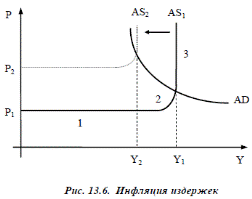 Инфляция издержек (cost-push inflation) возникает как следствие повышения средних издержек на единицу продукции и снижения совокупного предложения. Повышение средних издержек относительно сокращает прибыли фирм, что приводит к снижению выпуска фирм и спаду совокупного предложения. При прежнем уровне совокупного спроса снижение совокупного предложения приводит к росту среднего уровня цен и увеличению темпа инфляции.