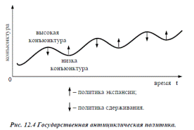 Мероприятия антициклической политики государства направлены на сглаживание циклических колебаний в направлении, противоположном существующим на данный момент колебаниям конъюнктуры, мерами фискальной и монетарной политики. Самостоятельной частью в рамках антициклического регулирования является антикризисная политика — политика, противодействующая падению ВНП, росту инфляции и безработицы.