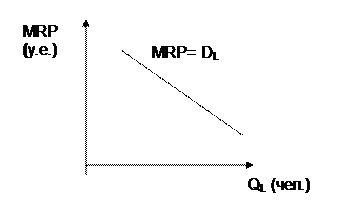 Предельный продукт в денежном выражении (предельная доходность ресурса) MRPпоказывает изменение общей выручки при использовании добавочной единицы ресурса. Спрос на ресурс (D) зависит от MRP, т.к. отдача в деньгах убывает, каждая добавочная единица будет спрашиваться фирмой только в случае снижения цены. На графике 9.1 изображена кривая спроса на труд DL, которая совпадает с кривой MRP , это также нисходящая линия.