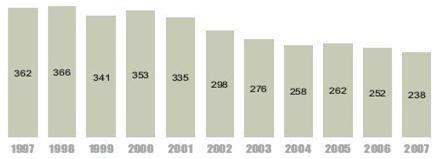 Рис.13.1. Динамика добычи золота в США в 1997-2007 гг., тонн[4]
