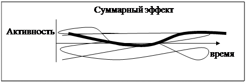 Для того чтобы избежать фатального краха организационного управления, надо «запустить» несколько деятельностей (процессов-причин) одновременно, размножить причины, смешать следствия. Тогда суммарный эффект станет стабильным, равномерным. Это можно увидеть на рисунке, если процесс естественной активности процессов-причин представить в виде некоторых плавных кривых на шкале времени. Сознательное введение в процесс новых тенденций может дать суммарный процесс, в котором не будет резких скачков и спадов, так как процессы эти будут перекрывать и компенсировать друг друга.