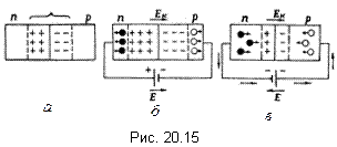 Сопротивление запирающего слоя можно изменить с помощью внешнего электрического поля. Если приложенное к р-n переходу внешнее электрическое поле направлено от n-полупроводника к р-полупроводнику (рис. 20.15б), т.е. совпадает с полем контактного слоя, то оно вызывает движение электронов в n-полупроводнике и дырок в р-полупроводнике от границы р-n перехода в противоположные стороны. В результате запирающий слой расширяется и его сопротивление возрастает. Направление внешнего поля, расширяющего запирающий слой, называется обратным. В этом случае через запирающий слой протекает слабый обратный ток, обусловленный неосновными носителями тока (электронами в р-полупроводнике и дырками в n-полупроводнике).