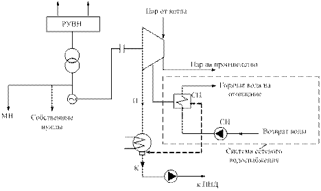 | Рис. I.5. Принципиальная технологическая схема энергоблока ТЭЦ (СН – сетевой насос; СП – сетевой подогреватель; МН – местная нагрузка) |