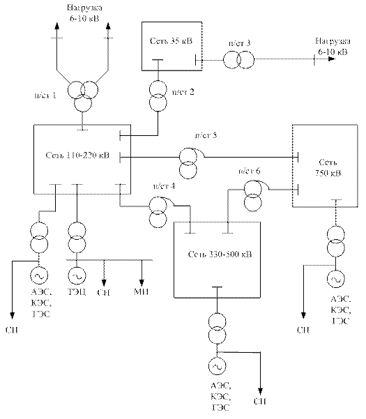 | Рис. I.1. Простейшая электроэнергетическая система (МН-местная нагрузка, СН – собственные нужды) |