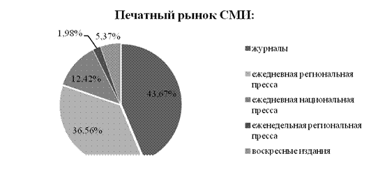 Рекламный рынок Франции характеризуется постепенным снижением интереса к периодической прессе на протяжении многих лет. Причин, обусловившие это, достаточно много, выделим внешние и внутренние. Внешними факторами можно назвать переход рекламодателей в альтернативные виды СМИ (телевидение, Интернет), а также экономический кризис. К внутренним относятся снижение тиражей, появление бесплатных изданий, неравномерное распределение рекламных доходов между различными секторами периодических изданий. Например, доходы от рекламы газеты «Монд» раньше составляли 40-50%, сейчас не превышают и 35%. Французская пресса получает лишь 13% от всего рекламного рынка, в то время как пресса Германии - 30%, 33% в Англии и 27% в США[2]. Однако современной тенденцией можно считать «выздоровление» рекламного рынка во Франции. В 2010 году доходы от рекламы выросли на 4,6%, хотя еще в 2009 они имели отрицательную динамику -18,1%. Стоит отметить, что приведенные выше данные касаются всего рынка СМИ в целом, но если рассматривать отдельно прессу, то тут также положительный рост доходов наблюдается у национальных ежедневных изданий (2,4%) и журналов (2,6%). Ежедневная региональная и специализированная пресса по-прежнему остаются с отрицательными показателями, но, тем не менее, они значительно меньше, чем в 2008-2009 годах [3]. Более подробные данные представлены в приложении 1.