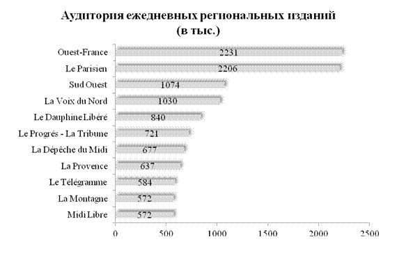 Численность аудитории связана непосредственно с территориально-демографическими характеристиками того или иного региона. Например, газета «Уэст-Франс» с аудиторией более двух миллионов является не только самой крупной в регионах, но также и на национальном уровне. Итак, аудитория ежедневной региональной прессы выглядит следующим образом: