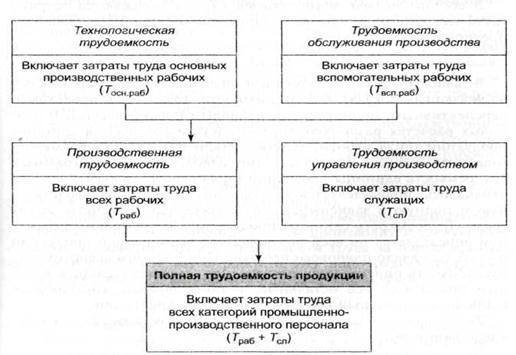 В зависимости от состава затрат труда, включаемых в трудоемкость продукции, и их роли в процессе производства выделяют технологическую трудоемкость, трудоемкость обслуживания производства, производственную трудоемкость, трудоемкость управления производством и полную трудоемкость (рис. 16.4).