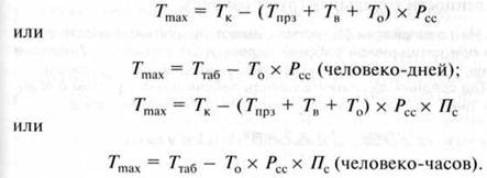 Максимально возможный фонд рабочего времени (Ттах) характеризует потенциальную величину максимально возможного для использования фонда рабочего времени рабочих в данном периоде, кроме выходных, праздничных дней и времени на очередные отпуска (То) и определяется по формуле: