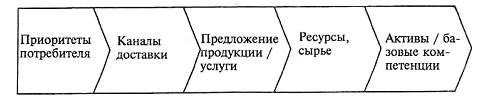 Мышление, ориентированное на потребителя, начинается с потребителя и достигает, в конце концов, активов и базовых компетенции. Такое мышление фокусируется на потребностях и приоритетах потребителей и выявляет варианты, через которые эти потребности и приоритеты могут быть наилучшим способом удовлетворены. Фактически в этом случае происходит реверс традиционной цепочки ценности таким образом, что первым ее звеном становится потребитель, а все остальные звенья уже согласуются с ним. Такая цепочка ценности называется современная (Рисунок 2.2.).