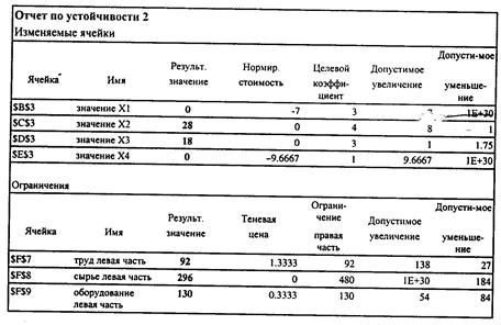 После увеличения запаса ресурса «труд» до 92 чел./ч было получено новое решение задачи. Изменение запасов ресурсов в пределах интервалов устойчивости двойственных оценок привело не только к изменению значения целевой функции на 16 тыс. руб., но и к изменению плана выпуска. При этом структура плана не изменилась - изделия, которые были убыточны, не вошли и в новый план выпуска, так как цены на ресурсы не изменились. Новый план выпуска составляет 28 ковров второго вида и 18 ковров третьего вида. Изменение общей стоимости продукции на 16 тыс. руб. (24 - 8 = 16) получено за счет уменьшения на 2 ед. ковров второго вида по цене 4 тыс. руб.