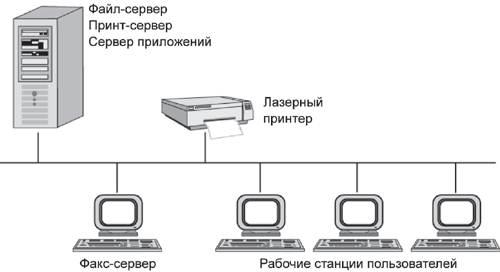 Главной целью сети отдела является разделение локальных ресурсов, таких как приложения, данные, лазерные принтеры и модемы. Обычно сети отделов имеют один или два файловых сервера, не более тридцати пользователей (рис. 10.3) и не разделяются на подсети. В этих сетях локализуется большая часть трафика предприятия. Сети отделов обычно создаются на основе какой-либо одной сетевой технологии - Ethernet, Token Ring. В такой сети чаще всего используется один или, максимум, два типа операционных систем. Небольшое количество пользователей позволяет применять в сетях отделов одноранговые сетевые ОС, например Windows 98.