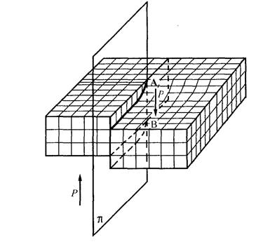 Кроме краевых встречаются винтовые дислокации, которые вызываются сдвигом на одно межатомное расстояние одной части кристаллической решетки относительно другой по какой-нибудь плоскости π под действием внешних касательных сил Р (рис. 8). Вокруг линии АВ, которая является линией дислокации, атомные плоскости закручены по винтовой поверхности.
